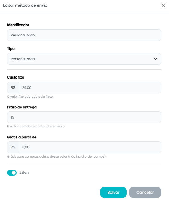 - Identificador: nome do método (ex: “PAC – Correios”, “Sedex”).
